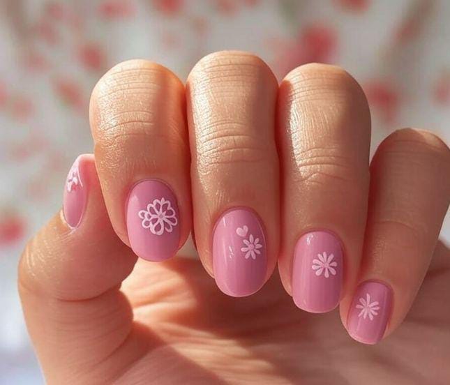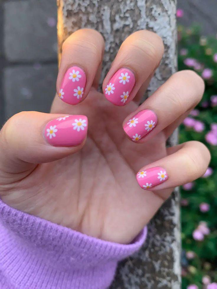 Soft pink nails with tiny white daisy accents create a sweet, cheerful summer look. The design feels fresh, playful, simple and perfect for short nails.