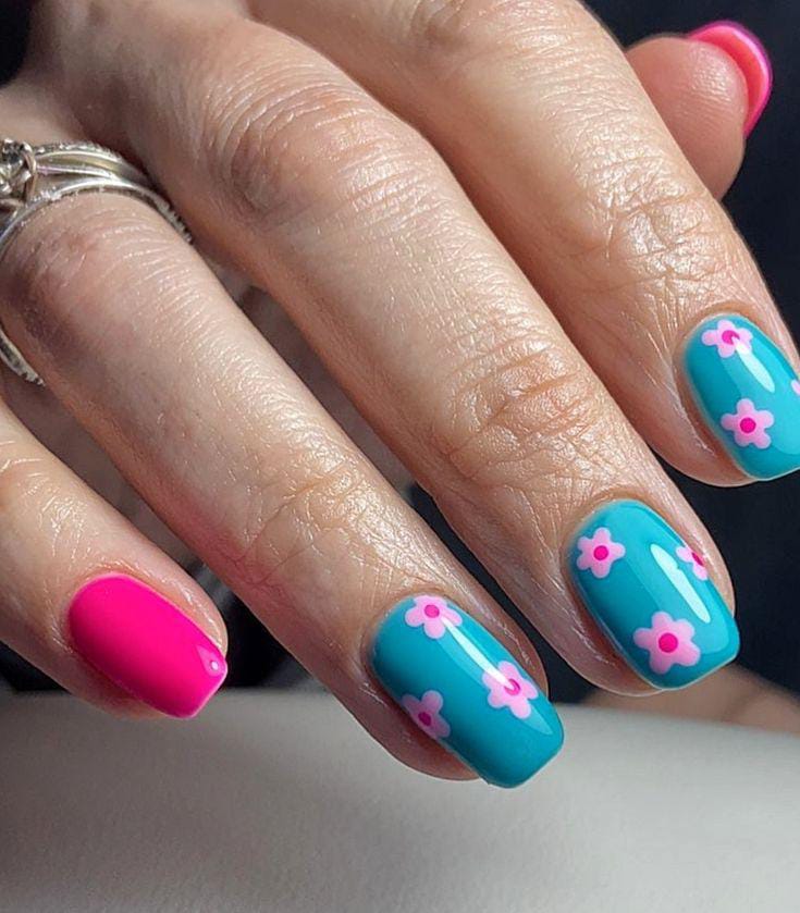 Bright teal short nails paired and single pink nails, with simple pink floral details give off a fun, retro summer vibe. The bold colors keep it lively while still looking clean and easy.
