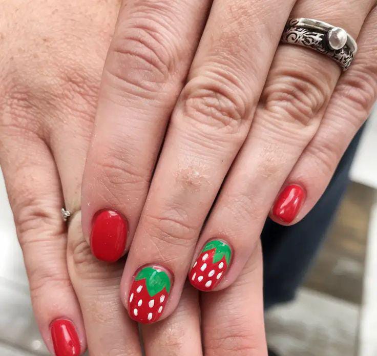 Classic red short nails with adorable strawberry art add a juicy, playful summer touch. The look is cute, youthful, minimal and full of seasonal charm.