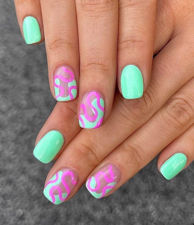 Cool mint green short nails mixed with soft pink swirl accents feel modern and trendy summer look. The abstract pattern keeps the design simple but eye-catching.