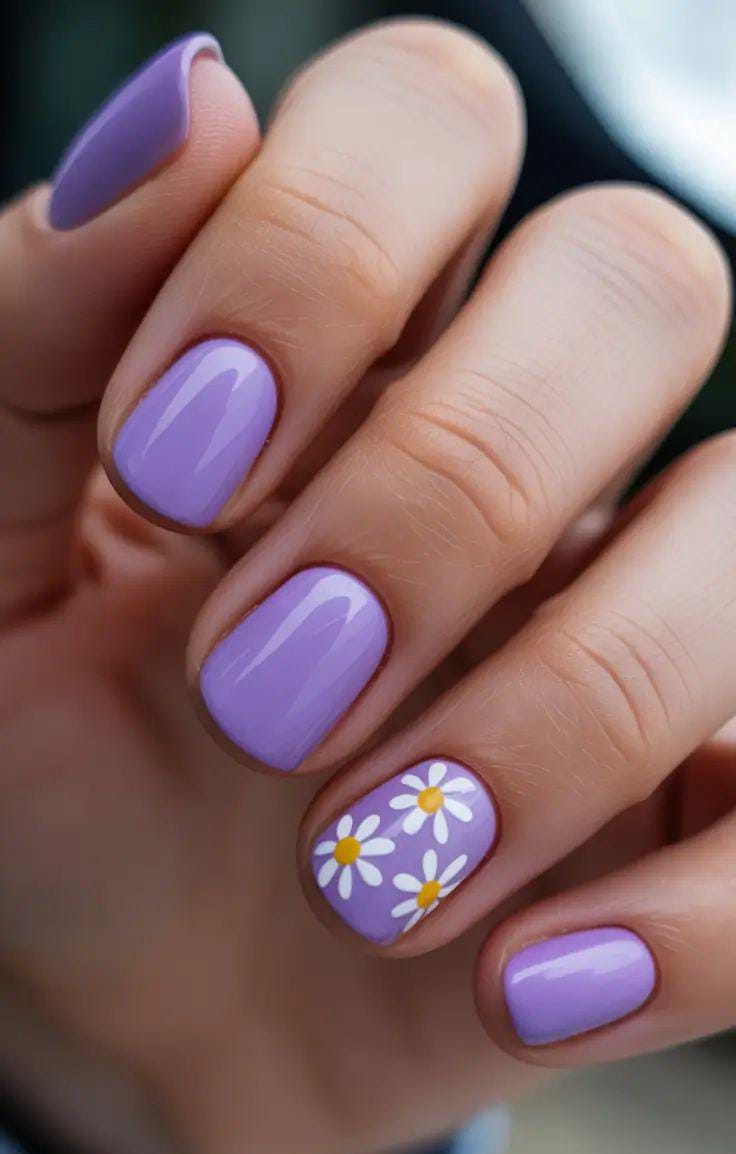 Light lavender short nails with minimal daisy art create a soft and relaxing summer style. The overall vibe is calm, feminine, and effortlessly cute.