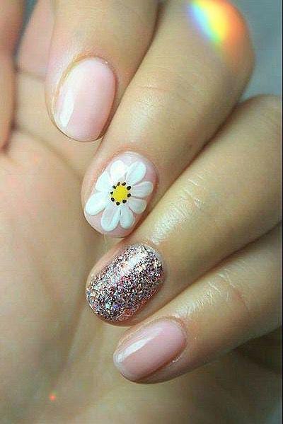 Soft blush short nails are accented with a simple daisy and a touch of glitter for subtle shine. The look is gentle, feminine, and effortlessly summery.