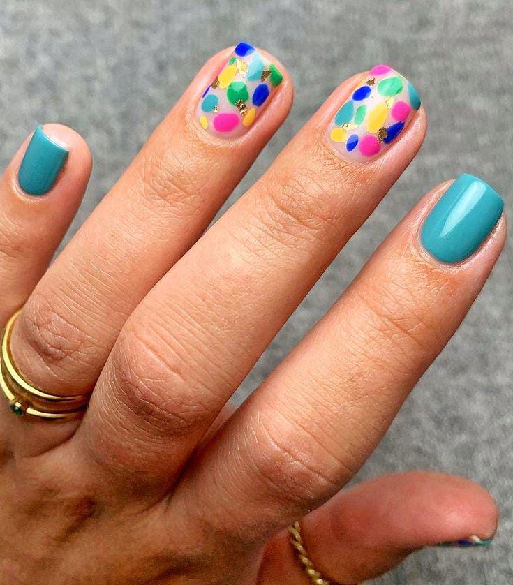 Muted teal short nails are balanced with a clear accent nail filled with colorful confetti dots. It has a playful, artsy summer vibe that feels minimal and fun without being too bold.