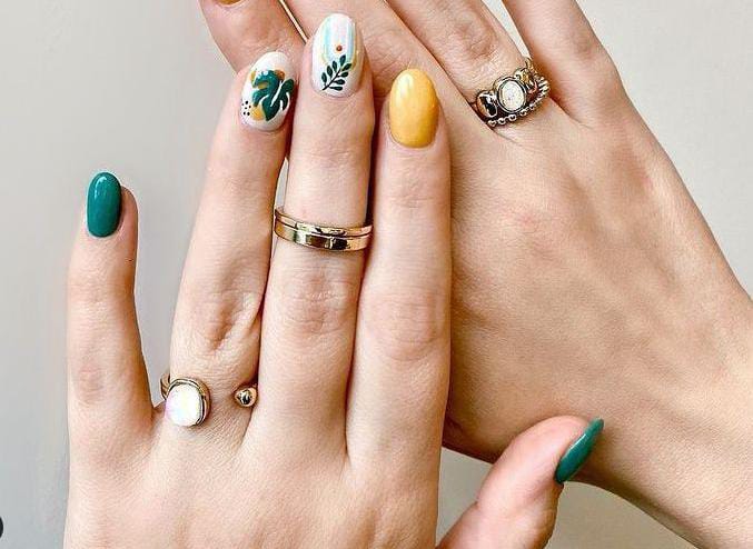 Green, yellow, and neutral short nails with delicate leaf and nature-inspired details. The overall style feels earthy, fresh, and perfect for a relaxed summer aesthetic.