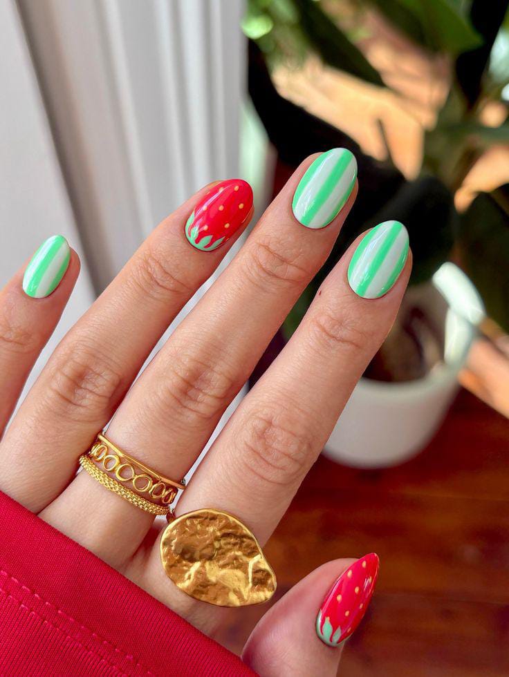 Fresh mint-green short nails are paired with bright red strawberry and simple line accents for a playful summer look. The design feels fun, juicy, and perfect for sunny days.