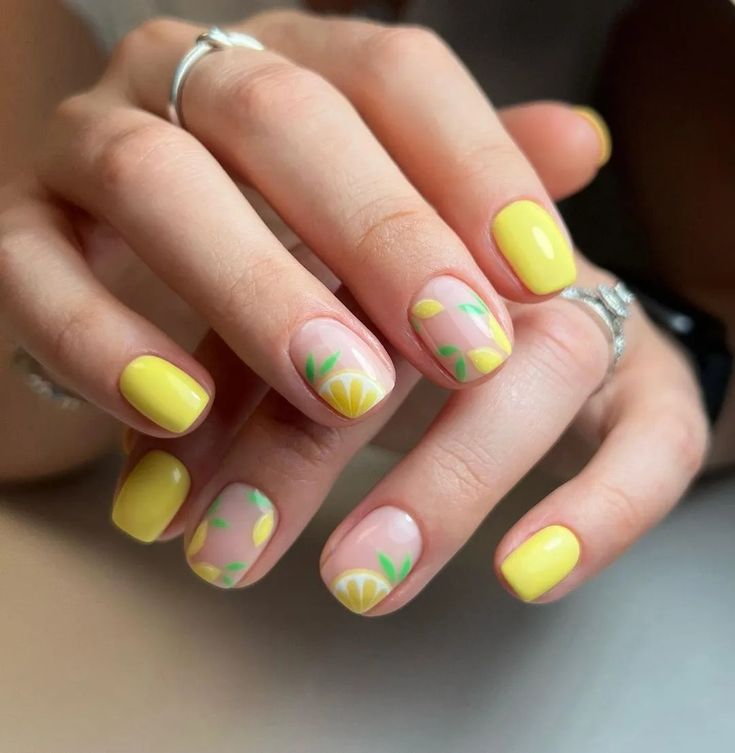 Soft yellow polish mixes with delicate lemon and leaf details on a natural base. The overall vibe is light, cheerful, and effortlessly summery.