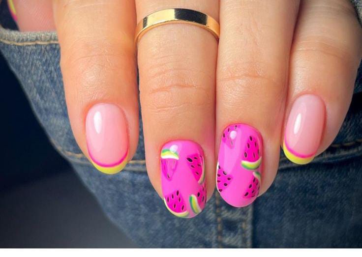 Hot pink and nude short tip nails with watermelon-inspired details bring a bold pop of color. This design feels vibrant, fruity, simple and full of summer energy.