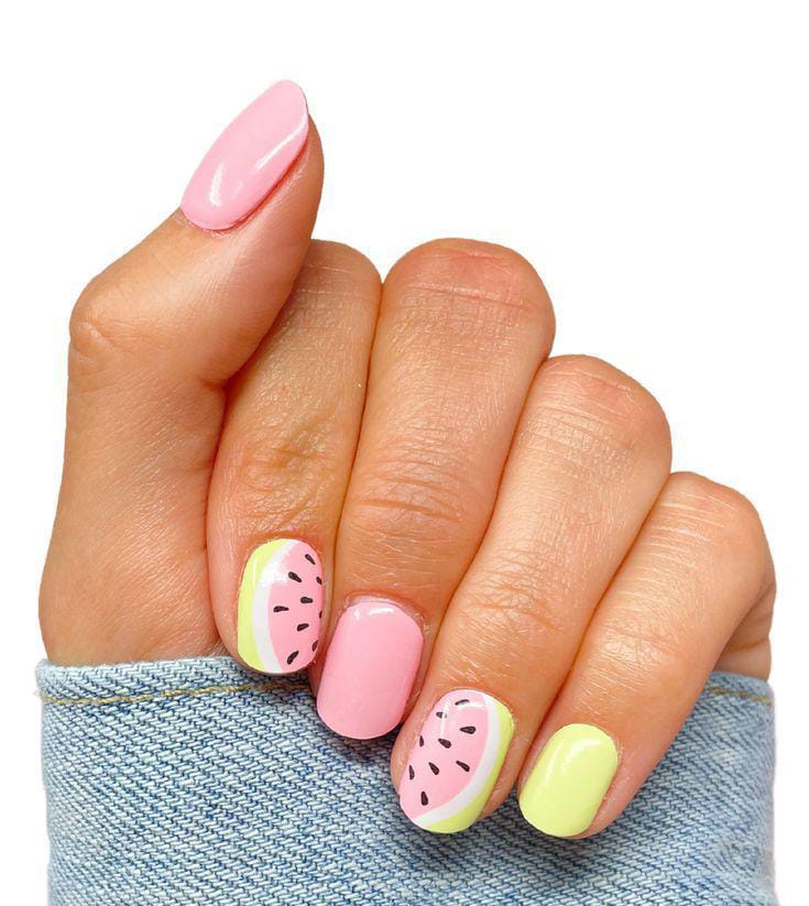 A soft pink base is accented with pastel green and tiny seed details for a cute watermelon summer look. The style is simple, sweet, and perfect for short nails.