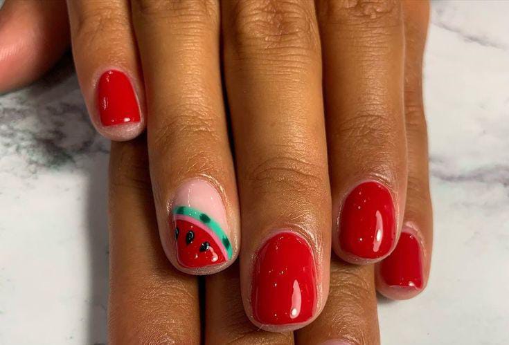 Glossy red short nails are paired with a subtle watermelon accent for a clean yet playful finish. The look is minimal, fresh, and timeless for summer.