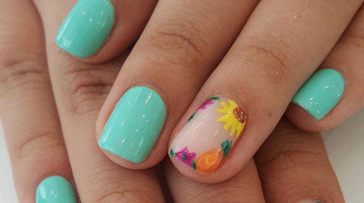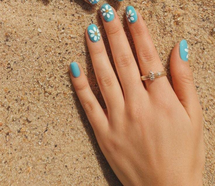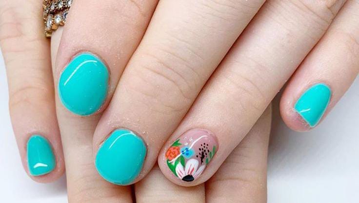 Bright turquoise short nails keep things fresh and clean, with a floral single accent adding a soft, artsy touch. The look feels playful yet simple, perfect for sunny summer days.