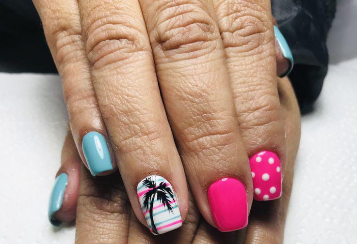 Pastel blue and bright pink short nails are mixed with simple dot patterns and a palm tree accent for a beachy feel. It’s fun, bold, and full of summer energy.