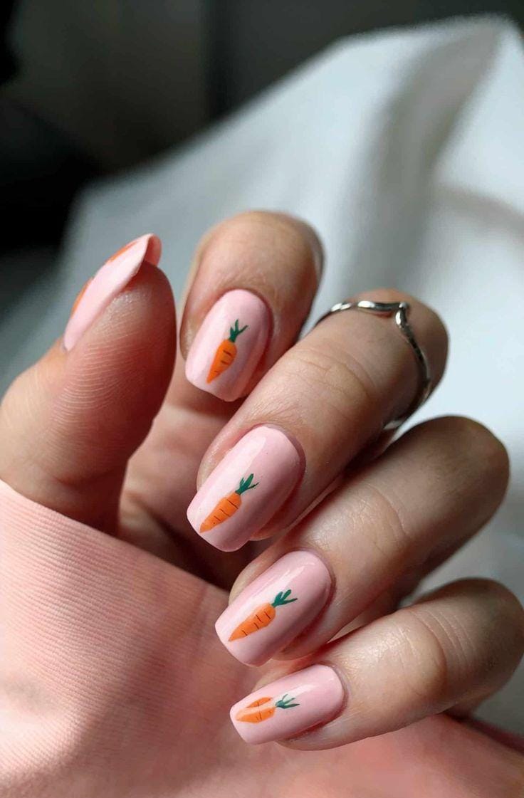 Soft pastel pink nails feature tiny carrot illustrations that give the design a playful Easter-inspired touch. The simple artwork and glossy finish create a cute, fresh spring vibe that feels light and cheerful.