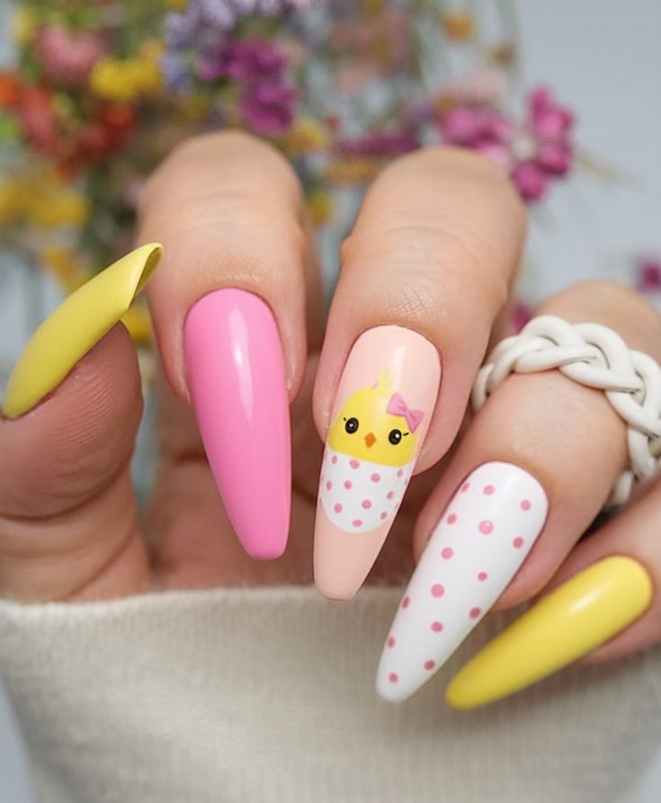 Bright pink, yellow, and white nails create a bold spring palette with a tiny chick accent design. The polka dots and glossy finish give the manicure a cute and festive Easter feel.