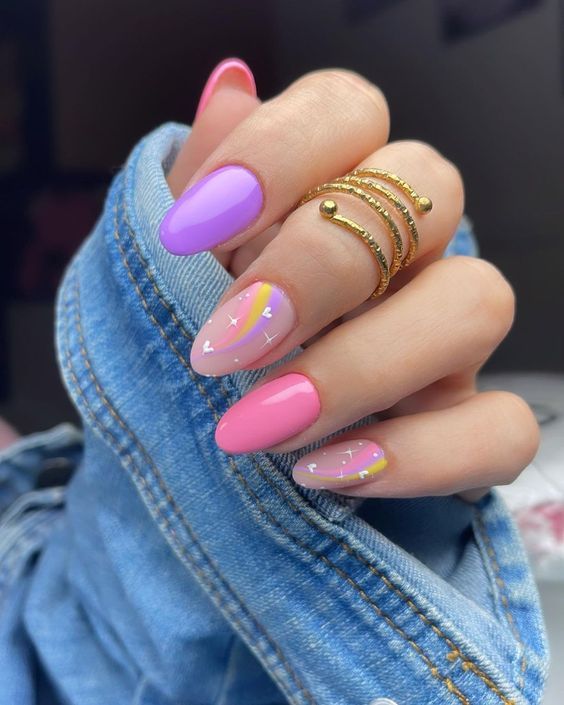 This design blends glossy pastel purple and pink nails with delicate star and swirl accents on a sheer base. The soft candy colors give it a fun, dreamy springtime feel.