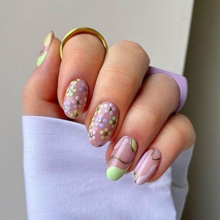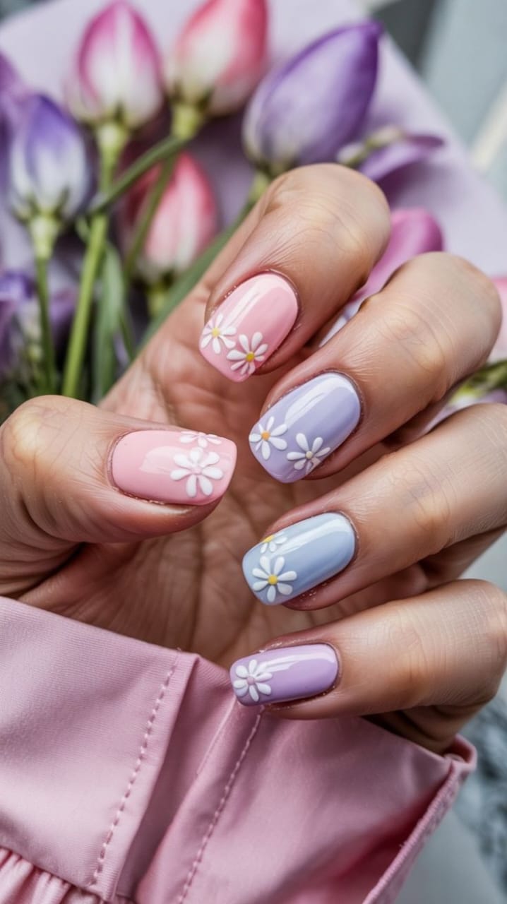 Short rounded nails feature soft pastel shades like pink, lilac, and baby blue with simple white daisy accents. The design is delicate, airy, and gives a calm spring garden aesthetic.
