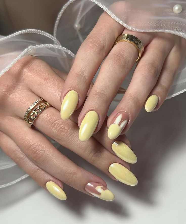 Glossy pastel yellow nails are paired with a cute bunny accent nail on a soft nude base. The simple Easter bunny detail makes the design playful, bright, and perfect for the holiday.