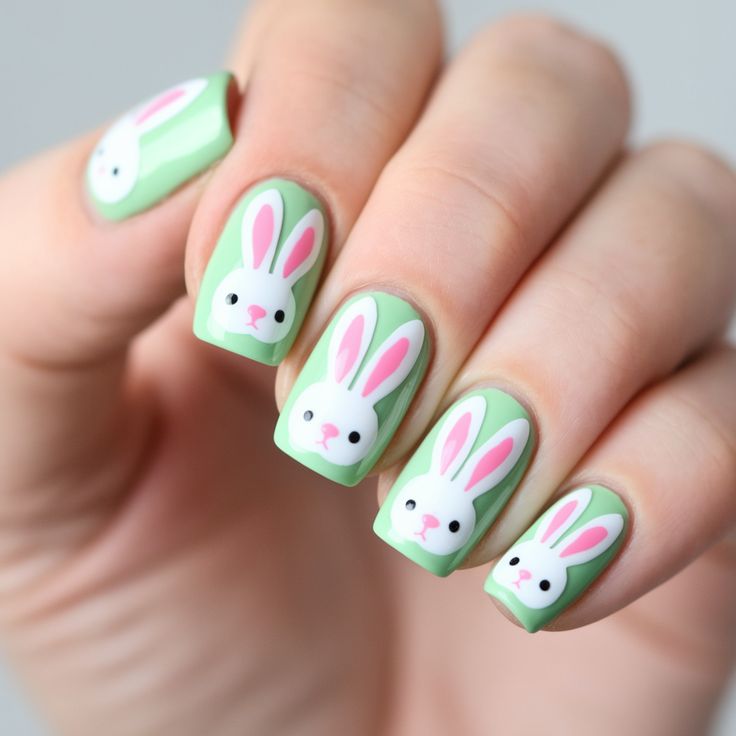 Soft green nails feature adorable white bunny faces that instantly bring a playful Easter vibe. The simple pastel base and cute bunny art make the design feel fun, fresh, and perfect for spring.