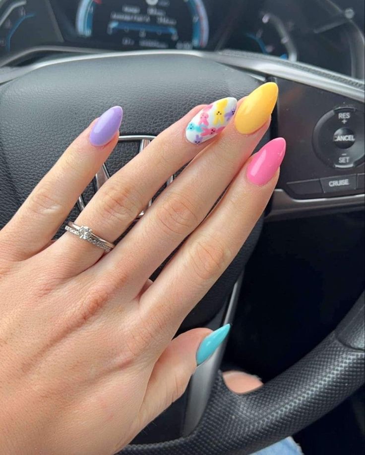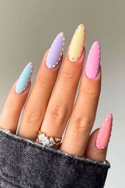 These almond-shaped nails feature soft pastel shades like lavender, baby blue, yellow, and pink. Tiny dotted details along the edges give them a cute Easter egg-inspired look.