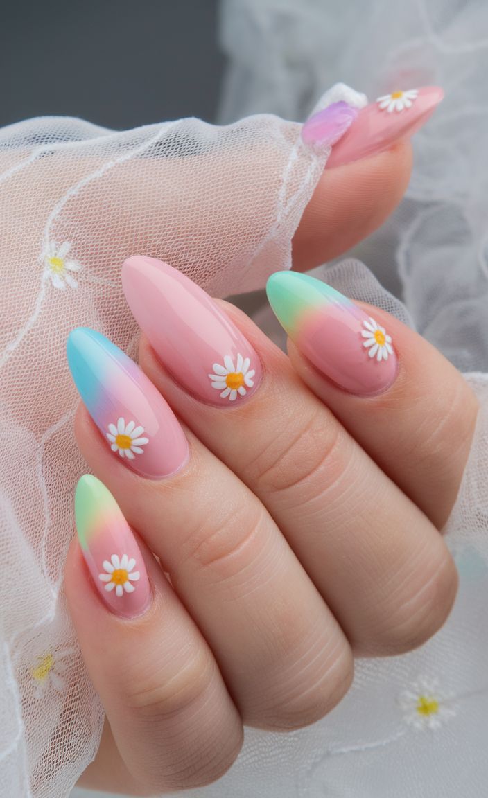 A soft pastel ombre blends shades of pink, mint, and blue for a dreamy spring gradient effect. Small white daisies add a delicate floral touch that feels light, fresh, and perfectly seasonal.