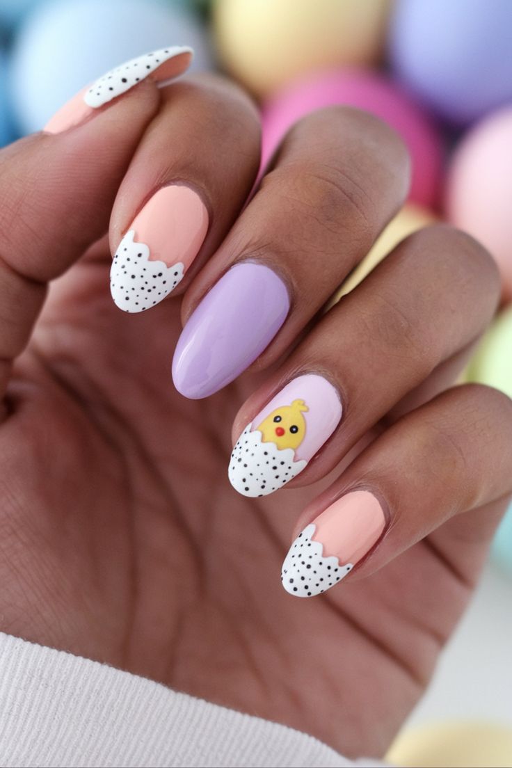 Soft pastel nails in peach, white, and lavender create a sweet spring palette. The design features speckled egg patterns and a tiny chick accent for a playful Easter vibe.