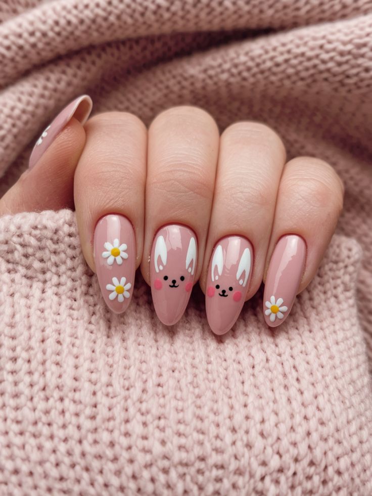 These glossy blush pink nails feature adorable bunny faces paired with simple white daisies. The design feels soft, cute, and perfectly suited for a cozy spring Easter look.