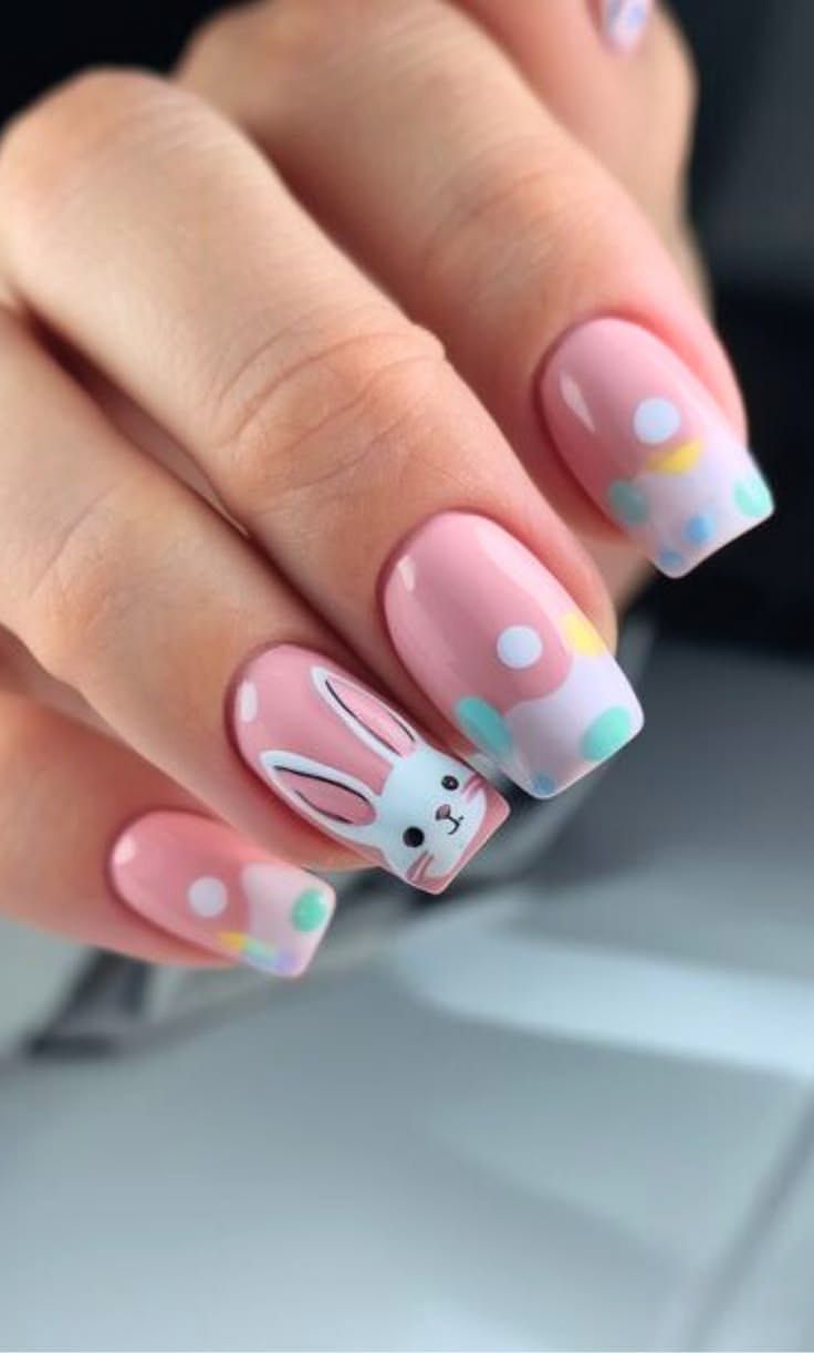 These soft pink nails feature pastel polka dot French tips that give a fun Easter egg-inspired look. A cute bunny accent nail adds a playful and festive spring touch.