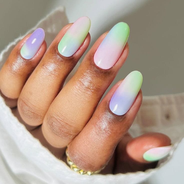 These glossy almond-shaped nails feature a soft pastel ombre blend of lavender, mint green, pink, and blue. The smooth gradient gives the design a dreamy, fresh spring vibe perfect for Easter season.