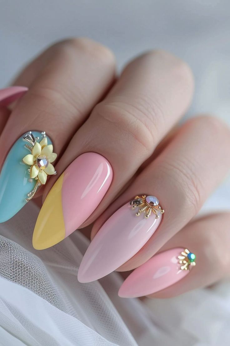 These glossy pastel nails mix soft pink, yellow, and blue tones for a fresh spring palette. Delicate floral and jewel accents add a pretty, elegant touch perfect for Easter.