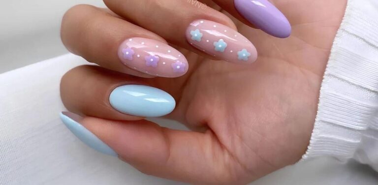 This design features glossy pastel tones like baby blue, lavender, and soft pink. Delicate little flowers and simple accents create a sweet, dreamy springtime look