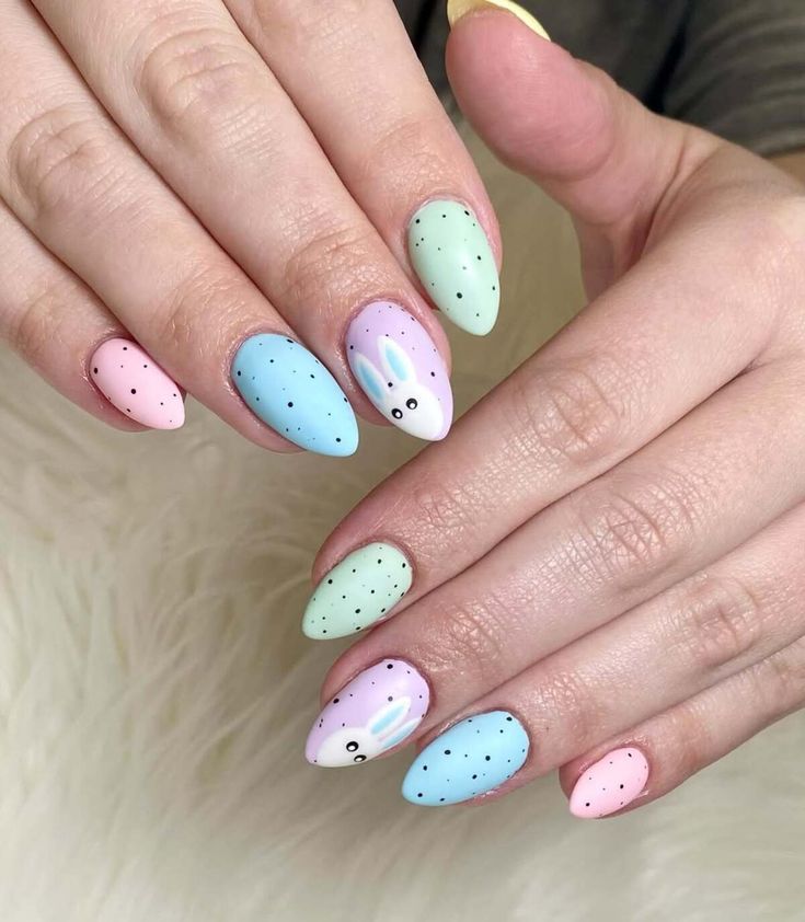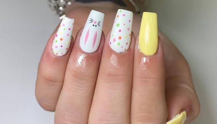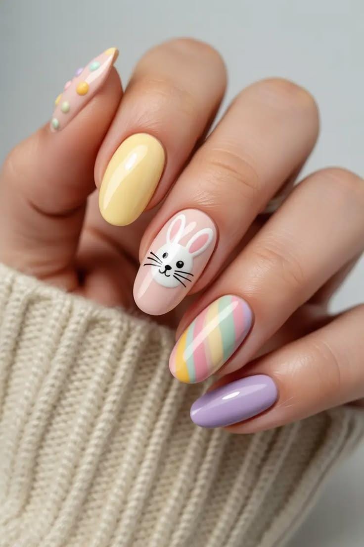 A mix of white, yellow, and soft pastel colors makes this manicure bright and festive. Polka dots and a simple bunny accent add a fun, playful Easter touch.