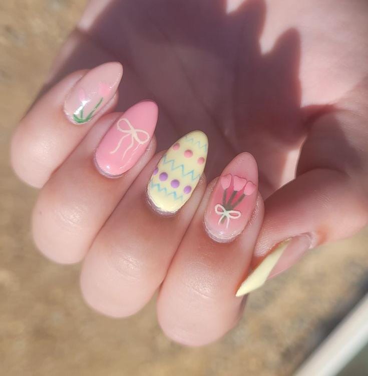 These soft pastel nails feature a mix of cute Easter-inspired designs like decorated eggs, bows, and delicate tulips. The playful colors and glossy finish create a cheerful, festive look that feels perfect for spring.