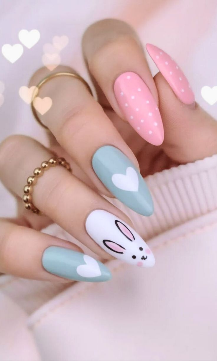 Soft pink and muted blue tones create a gentle pastel palette perfect for spring. Heart accents and a cute bunny face design give the manicure a charming, whimsical feel.