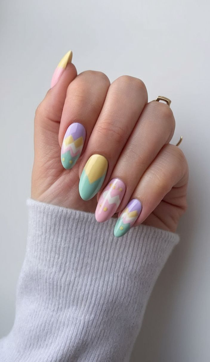 Soft pastel shades of lavender, mint, pink, and yellow blend with playful zigzag patterns inspired by decorated Easter eggs. The look feels bright, cheerful, and perfectly festive for spring.