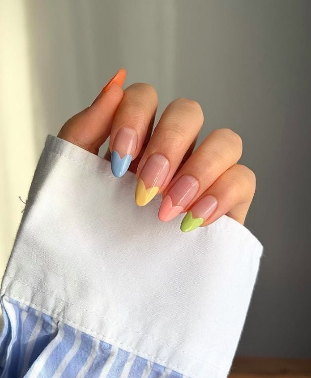A modern take on the French manicure with pastel heart-shaped tips in blue, yellow, peach, and green. It’s minimal, cute, and adds a soft romantic Easter vibe.