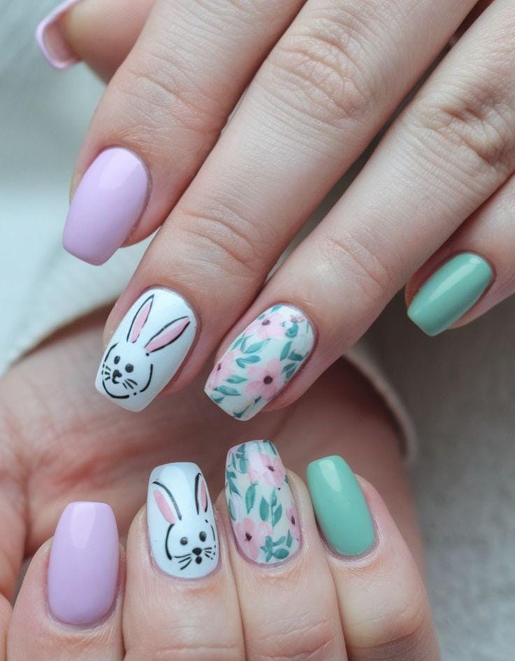 This manicure mixes soft pastel shades like lavender, mint, and baby blue with delicate bunny accents and tiny floral details. The gentle colors and minimal decorations give it a sweet, cozy springtime look.