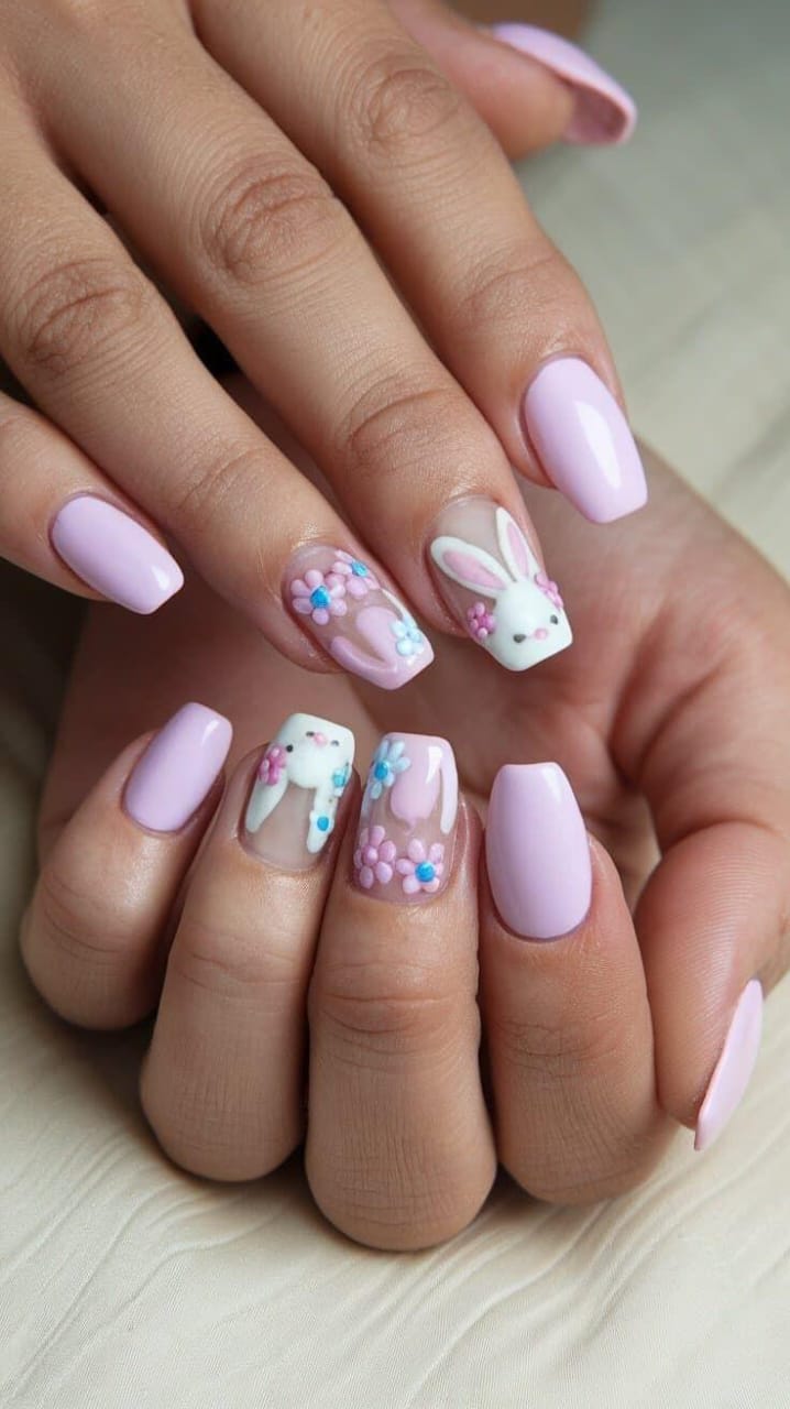 Light purple nails are elevated with subtle floral details and raised bunny art for a cute 3D effect. It feels gentle, cozy, and full of spring sweetness.