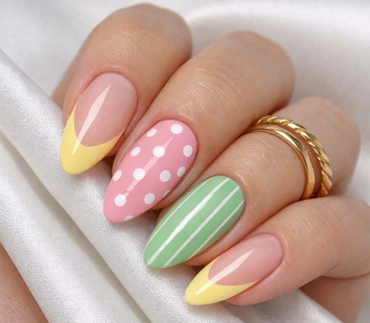 This short almond set blends soft yellow French tips with pink polka dots and fresh green stripes for a fun Easter vibe. The pastel color combo feels light, cheerful, and perfectly festive for spring.