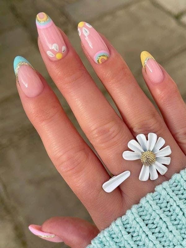 Soft nude nails are paired with pastel French tips in shades of mint, peach, and yellow, decorated with tiny colorful flowers. The look feels fresh, playful, and perfect for a light spring or Easter vibe.