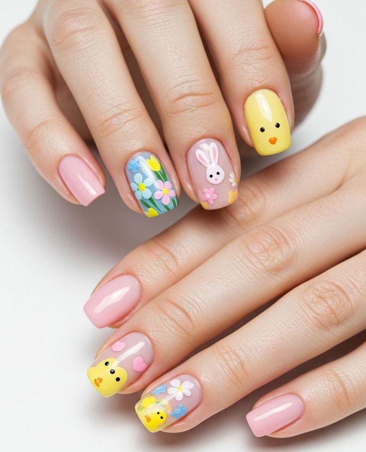 This short, rounded set mixes glossy pink nails with adorable bunny, chick, and floral designs in bright pastel shades. The overall look feels fun, cheerful, and full of sweet Easter charm.