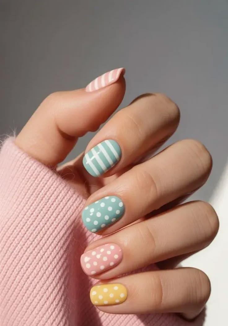 These short nails feature a mix of soft pastel shades with playful white polka dots and simple stripe accents. The overall look is sweet, minimal, and perfectly fresh for Easter.