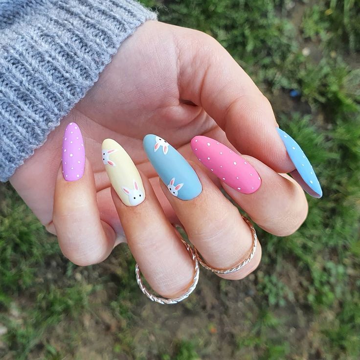 This almond-shaped set blends matte pastel tones in purple, yellow, blue, and pink with tiny bunny details and delicate dots. The design feels soft, cute, and subtly festive for spring.