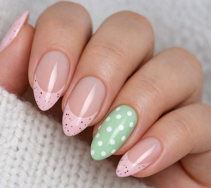 Soft pink French tips with delicate black speckles create a playful, egg-inspired look. The mint green accent nail with white polka dots adds a fresh, spring-ready pop of color.