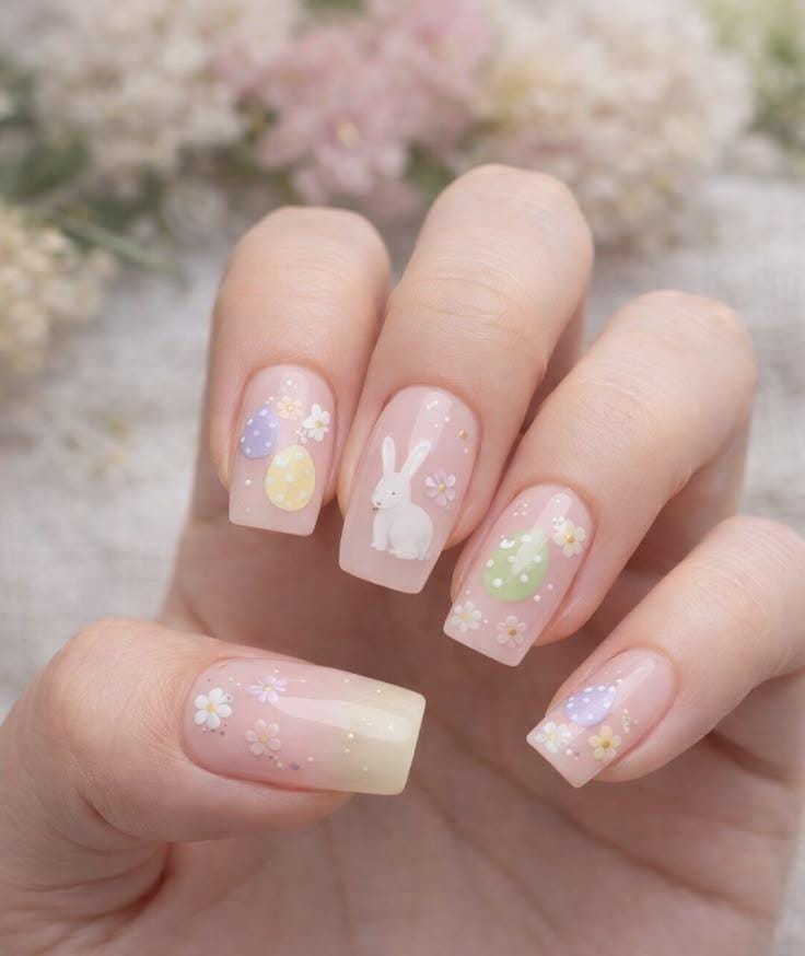This design features sheer pastel bases with tiny daisies, colorful Easter eggs, and a sweet white bunny accent. The overall vibe is soft, cute, and perfect for a light spring celebration.