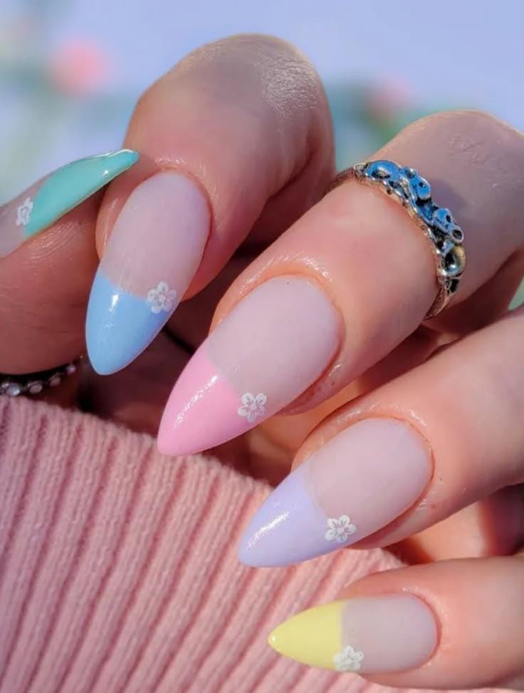 Muted pastel French tips in blue, pink, purple, and yellow give this set a clean and delicate finish. Tiny white flowers add a subtle floral touch that feels fresh and elegant for spring.