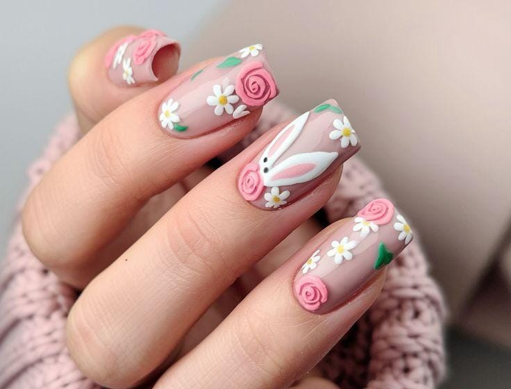 Soft nude nails are decorated with tiny daisies, pink roses, and a cute white bunny accent. The delicate floral details and pastel colors create a sweet spring garden vibe that feels perfect for Easter.