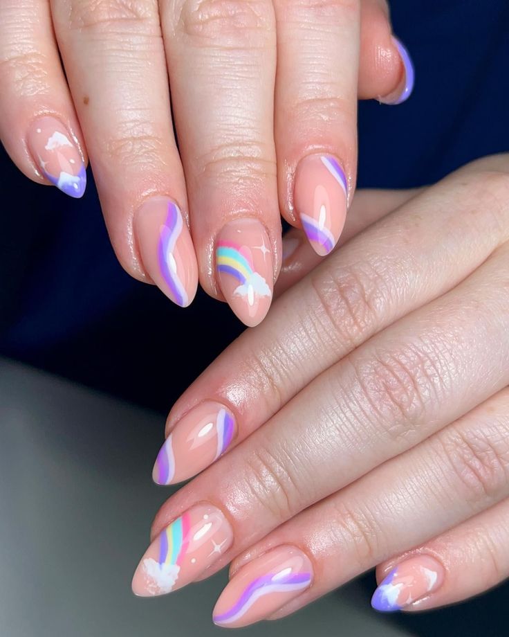 A glossy nude base features soft pastel rainbow waves and tiny white clouds. The design feels light, playful, and dreamy, capturing the cheerful colors of springtime.