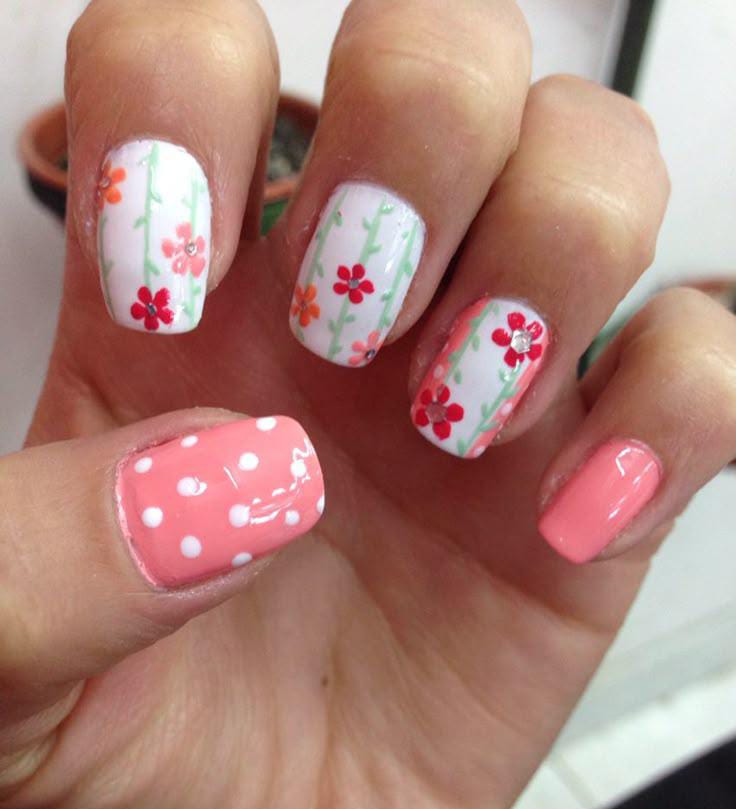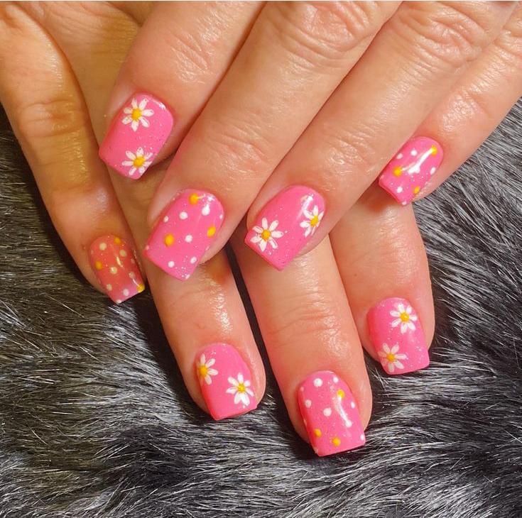 Soft pink and white gel nails are decorated with tiny flowers and playful polka dots. The overall style is cute, youthful, and full of springtime charm.