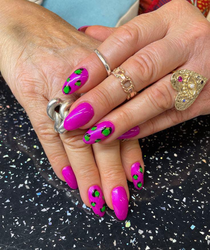 This design features bright pink gel nails with playful green and black leopard-style spots. The bold color contrast gives it a fun, confident, cute spring vibe with a trendy edge.