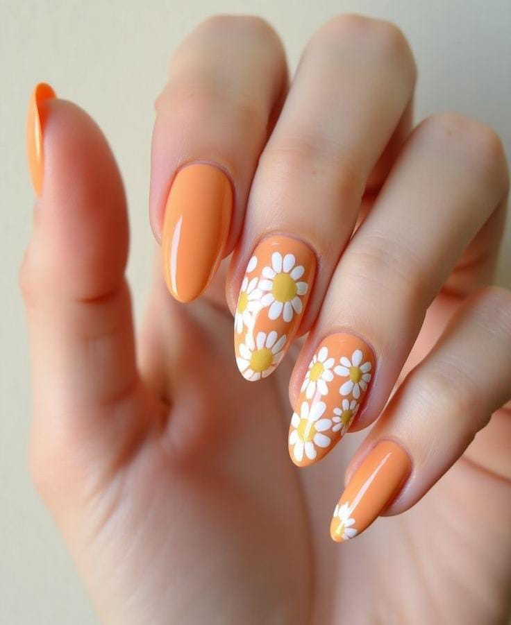 Warm peach gel nails are decorated with simple white daisy patterns. The overall style is soft, sunny, and gives a cute springtime feel.