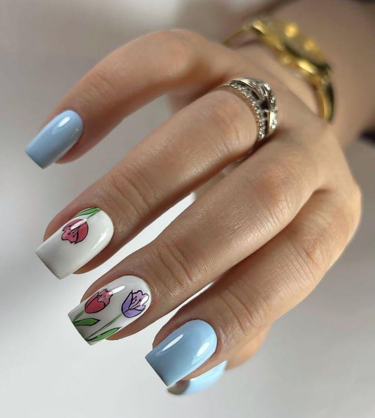 This design mixes baby blue and white gel nails with minimal tulip floral art. It feels calm, elegant, and inspired by a cute spring garden.